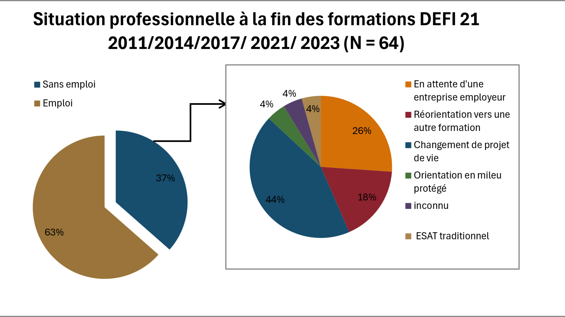 Ce dispositif DEFI 21 a été créé en 2011 pour permettre aux personnes avec trisomie 21 ou d’autres troubles du développement intellectuel, d’envisager un emploi en milieu ordinaire de travail et de maintenir son emploi. En 2024 :